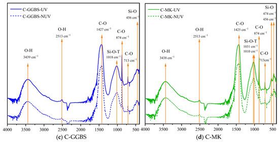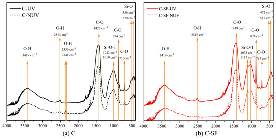 FTIR spectroscopic analysis was performed on the samples cured for 28 days under UV and non-UV conditions (Figure 8). As shown in Figure 8, all the samples provided clear FTIR bands at 713, 875, and 1427 cm−1, confirming that calcite was the main polymorph of calcium carbonate [38]. In contrast, the FTIR peaks of vaterite and aragonite phases could not be clearly identified. This is because the FTIR bands of vaterite (at 876 cm−1), aragonite (at 856 cm−1), and amorphous calcium carbonate (at 866 cm−1) overlap with those of calcite, and their contents are much lower than that of calcite [39]. Moreover, in combination with the spectra of raw materials (Figure 2), it can be found that the broad band between 900 and 1200 cm−1 may be related to Si-O vibrations. The specimens cured with UV radiation exhibited a more pronounced signal in this range, which could be related to decalcification due to the carbonation reaction and dehydration of phases induced by UV radiation [40].