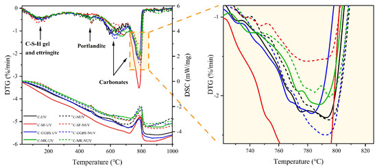 DTG-DSC curves of samples cured for 28 days with or without UV radiation.