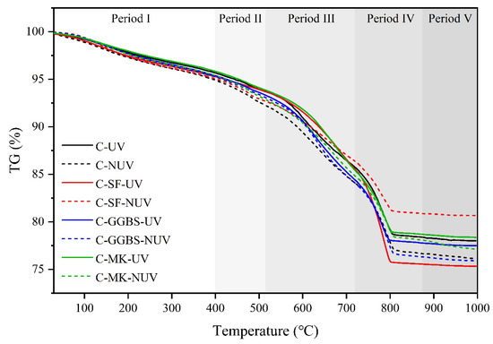 Minor differences were observed between samples from groups C and C-GGBS; the samples from both groups contained more weakly crystallised calcium carbonate under UV radiation, which is consistent with the XRD results. For the C-MK group, a partial shoulder peak was observed at the calcium carbonate decomposition peak in period IV under the NUV condition. This can be attributed to the presence of vaterite and aragonite, and this shoulder peak disappears in the specimens under UV radiation [40].