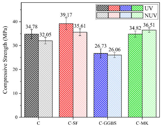 Compressive strength and Vickers hardness were evaluated to characterise the changes in the mechanical properties of the cement samples at the macroscopic and microscopic levels, respectively. The strengths of the cement materials cured under UV and non-UV conditions were evaluated comparatively to determine the changes in the overall mechanical properties of the specimens according to the curing condition and SCM type (Figure 12). The compressive strengths of the UV groups were higher than those of the NUV groups, except for group C-MK. This result indicates that more carbonation products filled the structural pores and improved the density and mechanical properties of the cement specimens under the promotional effect of UV radiation [45,46]. In contrast, in the C-MK group, the reduction in compressive strength in the UV group is probably due to the crystalline transformation under the action of UV radiation or microcracks produced by the massive filling of carbonation products.