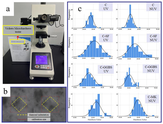 The Vickers hardness test was conducted using the TMVP-1 Microhardness tester, as shown in Figure 13a, and the resulting image is shown in Figure 13b. As shown in Figure 13b, the yellow area is a diamond indentation, and the red area is the calibration size. The variation pattern of the microhardness is difficult to rationalise due to the large variability in the developed composition and structure of the samples at the microscopic scale. Therefore, in this study, the surfaces of the samples were evaluated by testing the Vickers hardness values of 64 locations on an 8 × 8 grid. The data obtained were fitted by SPSS distribution, as shown in Figure 13c, and calculated to obtain its mean and standard deviation, listed in Table 3 [47]. As shown in Table 3, the samples cured under UV radiation were found to have higher mean values and standard deviation of hardness due to the UV-promoted carbonation reaction, resulting in the generation of calcium carbonate with excellent micromechanical properties in the structure composed of hydration products. This resulted in a compound enhancement in the microhardness, and it was noted that the microhardness of the samples increased with increasing degree of carbonation [48]. This result suggests that UV radiation can improve the cement microstructure and the corresponding mechanical properties in some surface areas of the hardening pastes. However, as a larger number of hydration products is involved in the carbonation reaction, a part of the original structure is destroyed, and new product phases are generated, resulting in decreased uniformity of the surface mechanical properties at the microscopic scale. Thus, the dispersion of the surface microhardness increases, resulting in a larger standard deviation of the test results.