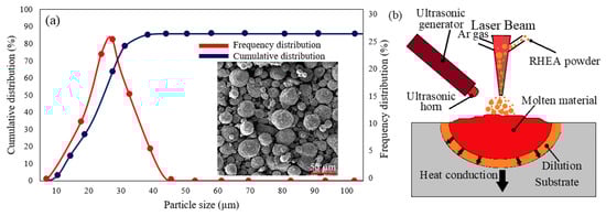 (a) SEM morphology and particle size distribution of RHEA powder; (b) schematic of laser cladding process equipped with ultrasonic.