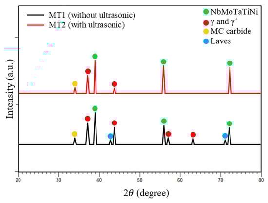 Figure 6 confirms the formation of the above phases along with its EDX results in Table 3. It should be noted that the un-melted RHEA powders are the place of stress concentration due to their high brittleness. So, there are often porosity and cracks around these powders (Figure 5). In the MT2 specimen, the vibration caused by the ultrasonic field causes flow in the liquid under the right conditions, and it causes the rapid formation of micro-bubbles, which causes intense heat for the growth and unification of these bubbles, until they reach the maximum size and finally burst. The heat generated by the cavitation effect melts the powders. The vibration generated by the cavitation effect also causes the uniform distribution of melted powders throughout the coating. This was despite the fact that in the MT1 specimen, there is only the Marangoni force, which leads un-melted powders to the bottom of the liquation pool (due to the high density of the powder) and the edges of the liquation pool.