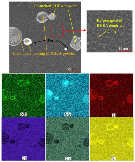 Map analysis of un-melted RHEA powder sample MT1 during laser cladding.