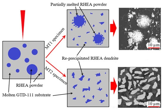 Figure 7 shows a schematic of the coating material solidification process for both the MT1 and MT2 samples. As can be seen, the substrate melts completely after laser irradiation due to its lower melting point than the coating. Powders with small particles are completely melted in both the MT1 and MT2 specimens. Powders with larger particles in the MT2 specimen have also wholly melted. However, the larger particles of the MT1 specimen are incompletely melted at the edges. During non-equilibrium laser heating, the edges of the powder react with the matrix and partially melt and decompose. These places also act as stress concentration centers during the cooling of the liquation pool, and for this reason, crack formation around these particles is observed.