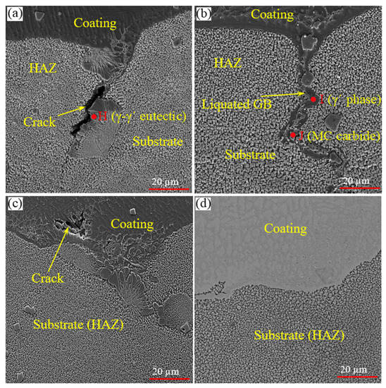 (a) Liquation crack formation in the HAZ of sample MT1. (b) Formation of grain boundary liquation in the HAZ of sample MT1. (c) Cracking caused by thermal stresses at the beginning of the coating. (d) No defect formation in the HAZ of sample MT2.