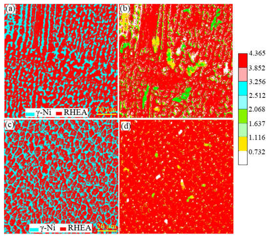 EBSD results of the phase distribution, KAM maps, (a,b) MT1 specimen, and (c,d) MT2 specimen.