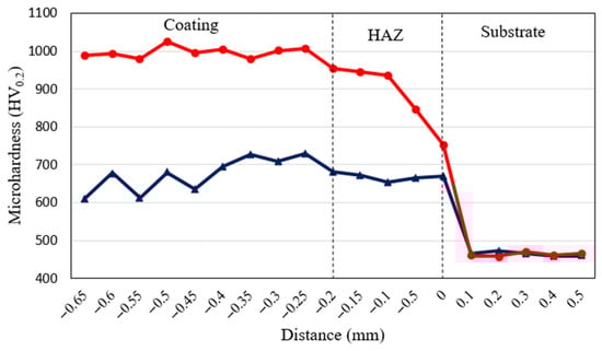 Figure 14 shows the hardness results of the MT1 and MT2 specimens. As can be seen, the coating hardness of both specimens is significantly higher than the substrate. This is attributed to the high inherent hardness of the coating particles and the grain refinement process in the coating, which is one of the characteristics of laser cladding [38]. As expected, the average hardness number in the MT2 specimen is about 42% higher than that of the MT1 specimen. One of the reasons for this is the smaller average grain size and the number of smaller grains in the MT2 specimen compared to the MT1 specimen (see Figure 11). Another effective factor in the hardness of the MT2 specimen is the uniform distribution of the microstructure. As can be seen in Figure 14, specimen MT2 experiences less hardness fluctuation than specimen MT1, which is attributed to the uniform distribution of the structure. The uniform distribution of the microstructure in MT2 is also attributed to the effect of cavitation and the creation of impact forces caused by the bursting of bubbles in the entire coating. Meanwhile, in the MT1 specimen, the Marangoni force in the coating led the coating material to its lower part, resulting in uneven hardness distribution. As shown in Figure 13, the residual stress in the MT1 specimen was higher than in the MT2 specimen. This helps to increase the hardness of the MT1 specimen. However, the hardness results in Figure 14 shows that the facts of smaller grain size, the number of smaller grains, and the uniform distribution of the microstructure have a more effective impact on increasing the hardness of the microstructure. This is confirmed in the study of Taheri et al. [38].