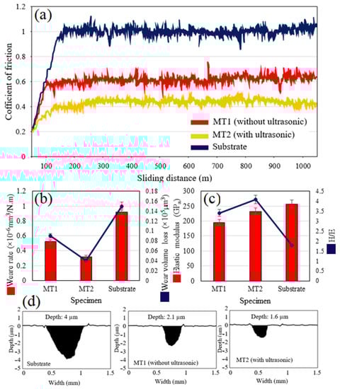 Figure 15 shows the wear test results of the substrate and the MT1 and MT2 specimens, which include the coefficient of friction (COF), wear rate, and wear volume lost. It is clear that the substrate, with an average COF of 1.12, has a higher COF than the MT1 and MT2 specimens with the COF of 0.62 and 0.42, respectively (Figure 15a). In confirmation of the COF results, the results of the wear volume loss and the wear rate in Figure 15b for the substrate, MT1 and MT2 specimens are from the highest to the lowest. So, the amount of wear volume loss for the substrate, specimen MT1, and specimen MT2 was 0.147, 0.092, and 0.038 × 105µm3, respectively, and the wear rate for the substrate, specimen MT1, and specimen MT2 was 0.91 × 10−6, 0.54 × 10−6, and 0.32 × 10−6 mm3/Nm, respectively. These results are in agreement with the hardness test results. It is stated in the literature that with the increase in the hardness, the wear resistance increases [39]. The weaker wear behavior of the substrate compared to the coating was not unexpected. The better wear behavior of the MT2 specimen compared to the MT1 specimen, as studied in the previous sections, is attributed to the fineness of the grain, the grain aspect, the uniform distribution of the microstructure, and the absence of cracks, all of which are caused by the cavitation effect of the ultrasonic field. In addition, it is stated in the literature that the wear rate is also dependent on the relationship between the hardness (H) and elastic modulus (E) [40,41,42]. So, the wear resistance increases with the increase in the H/E. The value of E for each of the substrate samples, MT1 and MT2, is obtained according to Equation (2) as follows: