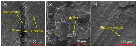 Worn surfaces of the sample (a) substrate, (b) MT1, and (c) MT2.
