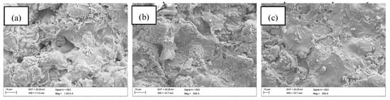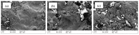 Figure 2 shows the micromorphology of the arc-sprayed Zn, Zn15Al, and Zn45Al coatings. It can be seen from the surface that the three kinds of coatings have the same characteristics: they are piled up with a large amount of splash flattened particles. Some small balls are embedded in and adhered to the surface. This happens during the spraying process; the melting metal is atomized by nitrogen gas. As the particles impact the substrate with a typical speed of over 80 m/s, deformation and crash occur to these melting or semi-melting particles. A flattened layer forms on the substrate. Some particles experienced a more severe crash, and subsequently, a greater number of small balls were produced during this impact. Some small particles were produced during the atomization process since it can be quickly cooled down because of its very small size, and then it retains its spherical shape. The porosities of the three coatings are listed in Table 3. All coatings have a very high porosity, ranging from 6.16% to 13.34%. Additionally, there is also a layer of pores in all coatings from 1 to 5 within a 1 cm2 area. During the thermal spray process, the particles are not fully melted, and the speed of the particles is a bit low, so the particle(s) cannot be flattened completely, which leads to a very high porosity. Fortunately, this high porosity has very little effect on the anti-corrosion performance, which will be explained in greater detail in a later section.