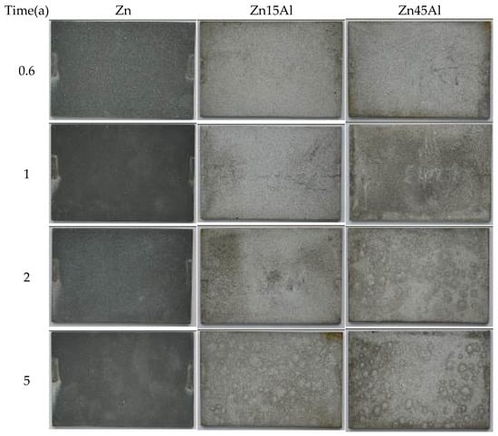 Figure 3 shows the variation in corrosion morphologies under long-term exposure in marine environments. For all coatings, no red rust percolated from the substrate during a 5 year exposure in marine environments. No bubbles, cracks, or peel-off phenomena can be found for all coating samples. White corrosion products can be found on all samples, which became denser and thicker as the exposure time increased. On some samples, bird excrement can be found covering part of the area of the sample, which can be dirt, and the white corrosion products are thicker. The failure of coatings is a complicated process. For sacrificial anodic metal coatings, barrier, passivation, and sacrificial effect are all functions of the coatings. Bubbles can sometimes deteriorate the electrical connection between the coatings and the substrate, which can hold back the cathodic protection effect. Only when the coating peeled off the substrate did this failure occur.