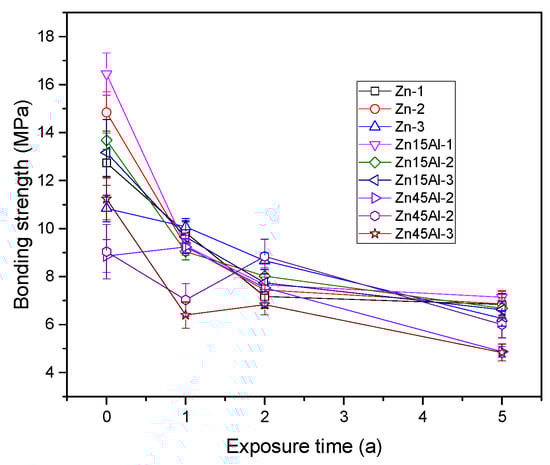 Figure 4 shows the bonding strength variation of the coatings during exposure to the marine environment. It can be seen that the bonding strength decreases from 8.67 to 17.85 MPa to 4.91–8.07 MPa. The Zn15Al coatings retained a bonding strength greater than 6.38 during the test, which is the highest value among the three kinds of coatings. Bonding strength is a key property of coatings that resist peeling off. Usually, corrosion products induce stress both in the coatings and between the interfaces, which could lead to the coating peeling off and decreasing its bonding strength. It is useful to prevent the coating from peeling off by decreasing the corrosion rate of the coating. It can also be found that zinc alloy coatings have a slower corrosion rate than zinc coatings. During the exposure period, the corrosion medium diffused into the coating and reached the substrate. First, corrosion happened to the coatings, and the corrosion products have a much lower bonding strength compared to the metal. Additionally, the corrosion products have a bigger volume compared to metal, and this volume increase by the corrosion products can decrease the bonding strength and even spall the coatings. The decrease in bonding strength, or peeling off, is the main failure type of metal coatings.