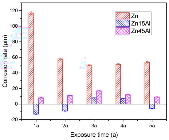 The corrosion rates of the coatings indicate that only a zinc coating has a very high corrosion rate, while Zn15Al and Zn45Al coatings both have a very low corrosion rate, which means the coating could not be depleted in at least 50 years in marine atmospheric environments.