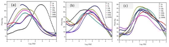 The Bode plot variation of the arc-sprayed zinc aluminum coatings during the exposure experiment: (a) Zn, (b) Zn15Al, and (c) Zn45Al.