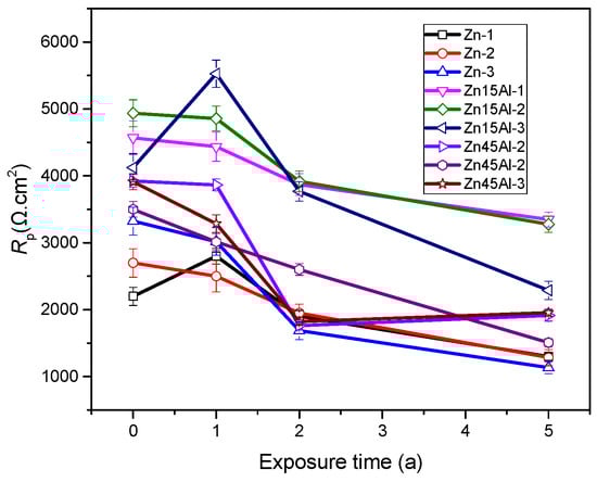 Changes in the polarization resistance of the arc-sprayed zinc aluminum coatings during the exposure experiment according to the spectra in Figure 7.