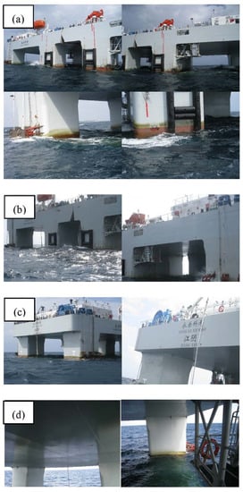 Corrosion status of the ship’s hull at the freeboard zones of the vessel Yongle after 3 years in the South China Sea. (a) Overall appearance. (b) Port side of the platform. (c) The starboard side of the platform. (d) The bottom of the platform.