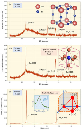 X-ray diffraction (XRD) patterns of the three copper nitride thin films, which were deposited onto glass substrates and specifically correspond to (a) specimen , (b) specimen , and (c) specimen . The 3D cubic structure of Cu3N is clearly illustrated as an inset in Figure 1b. This cubic structure of the unit cell contains six Cu atoms, and their fractional coordinates are the following: , , and . The fractional coordinate of the N atom is , which is in the center position of the present Cu molecules [26]. The first Brillouin zone of Cu3N, with the high-symmetry points , M , R , and X , are labeled and joined by red lines [27] and is shown as an inset in Figure 1c. Moreover, in subFigure 1c, the corresponding Raman spectrum of a representative thin film sample of CuN is presented, which was prepared at an RF power of and at a total gas pressure of .