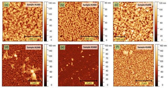 The two-dimensional AFM images of the thin films: (a,d) sample #1360, (b,e) sample #1460, (c,f) sample #1490, respectively.