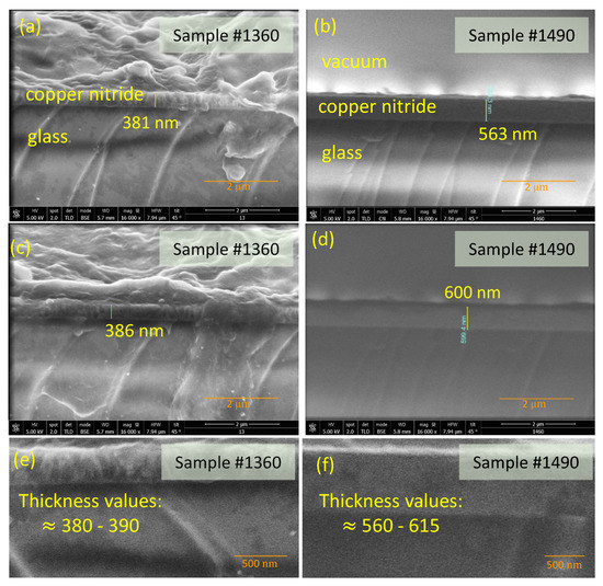 Lastly, the CuN thin-layer thickness, profile texture, and surface topography of the material were characterized via scanning electron microscopy (SEM). As a first step, the samples were mechanically cleaved in order to obtain SEM micrographs from the cross-section profiles along the growth direction, which allowed for the determination of the average thickness of each CuN layer. Afterwards, gold thin layers were deposited on all samples surfaces to avoid charging effects as a result of the electron beam’s contact with the sample. This was achieved by using a magnetron deposition process via plasma in a 208HR-Cressington Sputter Coater (Cressington Scientific Instruments, Watford, UK). It should also be added that the relevant experimental detail of the thickness of the very thin gold layer that was coated during the SEM analysis was just a few nanometers.