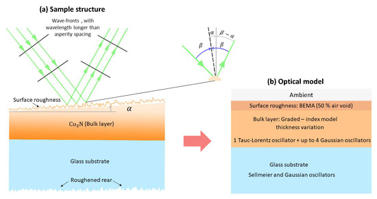 In the present investigation, the complex index of refraction of the thin films was determined via variable angle spectroscopic ellipsometry (VASE) measurements [13], which were carried out at different angles of incidence to obtain the two ellipsometric parameters psi () and delta (). In order to find a remarkable fit with the measured values of and , it is of paramount importance to propose a valid optical model. In our particular case, a one-dimensional graded index model was used throughout the whole layer from bottom to top, which was combined with a mixture of one Tauc–Lorentz (TL) oscillator [14,15,16,17,18,19] and up to four Gaussian (Gau) oscillators; these were successfully chosen to account for the bulk copper-nitride layer. A Bruggeman effective medium approximation (BEMA) model [20] was selected in order to describe the existing surface roughness layer. As a result, the optical constants of the thin layers were accurately obtained in the measured UV/visible/NIR spectral range. Our constructed optical model for determining the optical functions of thin layers is similar to the optical model suggested by Yan et al. [21,22,23] for the particular case of cesium lead bromide () thin films, where the authors also adopted a similar combination of several TL and Gau oscillators and the front rough superficial layer was added to the model as well. More details will be provided later in the paper.