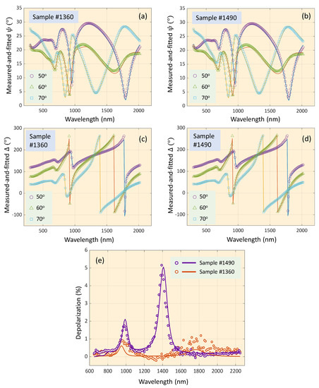 The depolarization spectra of the samples were measured by also employing the Woollam VASE ellipsometer in the spectral range of 300–; some of these spectra are shown in Figure 6e. Evaluation of the depolarization spectra was also carried out using the WVASE software.