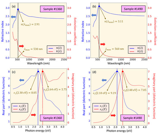 Let us now discuss the optical dispersion, or chromatic dispersion, which is an important parameter for more deeply understanding the optical properties of quasi-transparent (weakly-absorbing) Cu3N films. Optical dispersion is the required parameter in order to quantify the change in the material’s refractive index with respect to the incident light wavelength . Typically, in non-absorbing materials, the real refractive index increases with incident light frequency; that is, in the normal dispersion regimen. In the opposite case, where , we are in the anomalous dispersion regimen; that is, increasing the light frequency results in a decrease in the real index of refraction. In our RF-sputtered samples, the values of the vacuum light wavelength where the transition takes place (the so-called refractive index threshold wavelength), i.e., where , are and for the two representative samples #1360 and #1490, respectively (see Figure 7a,b).