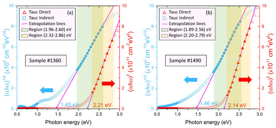 versus plot for the determination of the indirect energy band gap and versus plot for the calculation of the direct energy band gap, presented for the samples (a) #1360 and (b) #1490, respectively.
