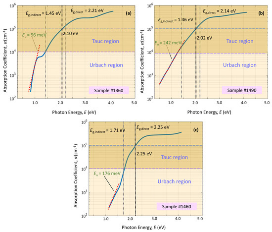 The indirect band gap was obtained by plotting the versus curve and by extrapolating the full line to the abscissa of (see Figure 9). Similarly, the direct band gap was found by extrapolating the full line to the abscissa of in the versus curve (see again Figure 9). The direct and indirect band gap values for the two representative specimens #1360 and #1490 were found to be and , respectively, and and , respectively. The alternate calculation of the indirect and direct band gap by using UV/visible/NIR normal incidence transmission measurements gave rise to practically the same values as those shown in Figure 9. This is explained by the fact that the simulated transmission almost coincides with the experimentally measured transmission up to the value of transmission of about 0.20 (see Figure 8).