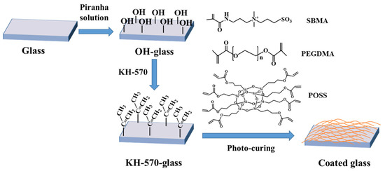 Schematic illustration of preparation process of glass coated with zwitterionic coatings containing POSS.