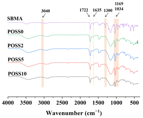 In order to investigate the chemical composition of the coatings, the coatings applied to the glass were carefully scraped off with a utility knife and characterized using FTIR spectra. As shown in Figure 2, the C-H stretching vibration peaks in SBMA appeared at 3040 cm−1, whereas the counterparts were not observed in POSS0, POSS2, POSS5, and POSS10. The C=O stretching vibration peaks were observed at 1722 cm−1 in all of the coating films and the SBMA monomer. The C=C stretching vibration peaks and the C-H bending vibration in -CH2=C of SBMA were observed at 1635 cm−1 and 1300 cm−1, respectively, but disappeared in all of the coating films. The disappearance of characteristic absorption peaks in the films indicated that the main component SBMA had been successfully crosslinked using the photocuring method. The asymmetrical and symmetrical stretching vibration peaks of S=O were observed at 1169 cm−1 and 1034 cm−1, respectively. These results suggest the successful preparation of the coatings. Herein, we found that the characteristic peaks of S=O were similar to that reported in the literature [29]. However, the characteristic C=O peaks of POSS were not identified at 1722 cm−1 due to its overlap with that of SBMA. Although it was reported that characteristic peaks of Si-O-Si were observed at 1119 cm−1 [34], the characteristic band falls into the asymmetrical characteristic peak of S=O, resulting in an inability to distinguish the respective characteristic peaks.