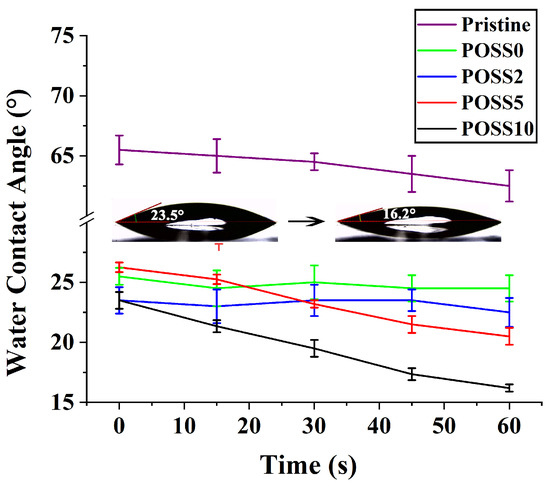 The WCAs of Pristine and glass coated by POSS0, POSS2, POSS5, and POSS10, measured in 60 s after standing for 5 s.