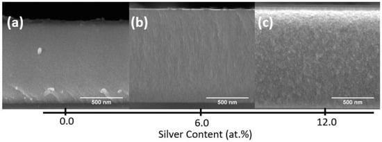 Figure 1a illustrates the cross-sectional morphology of the ZrSiN coating, displaying a homogeneous and featureless morphology. Upon the introduction of Ag, the cross-sectional morphology of the coatings undergoes noticeable changes. Figure 1b depicts the Ag-ZrSiN coating with a silver content of 6 at.%, revealing a fine nano-columnar growth pattern. By contrast, Figure 1c exhibits the coatings with 12 at.% Ag, characterized by a granular morphology, with the presence of nanosized particles.