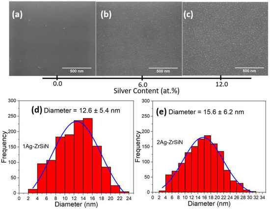 SEM images of the surface of the (a) ZrSiN, (b) 1Ag-ZrSiN, (c) 2Ag-ZrSiN coatings, and silver particle size distribution in (d) 1Ag-ZrSiN and (e) 2Ag-ZrSiN coatings.