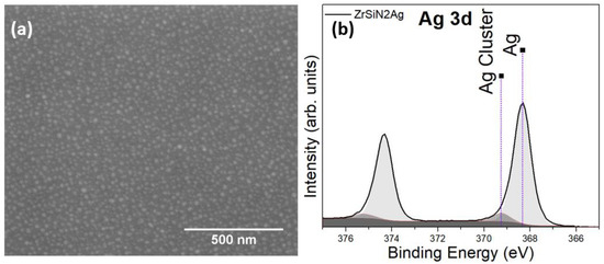 (a) Top-view SEM micrographs of the 2Ag-ZrSiN coating and (b) detailed spectrum of the Ag 3d of the surface coating.