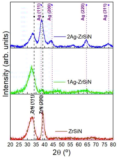 To investigate the formation of nanocrystalline phases in the Ag-ZrSiN coatings, X-ray diffraction (XRD) measurements were performed. Figure 5 shows the XRD patterns of ZrSiN, 1Ag-ZrSiN, and 2Ag-ZrSiN coatings on common glass substrates. The results indicate that the ZrSiN coating exhibits wide and low-intensity diffraction peaks at approximately 32.2° and 39.3°, corresponding to an fcc-ZrN structure, as reported in the PDF (Powder Diffraction File) database (01-078-1420). No diffraction peaks associated with the crystalline phase of Si3N4 were observed. Previous studies of ZrSiN coatings deposited under similar conditions have reported the presence of amorphous SiNx [24]. These results suggest that the ZrSiN coating consists of a mixture of phases: a nanocrystalline fcc-ZrN and an amorphous SiNx phase.