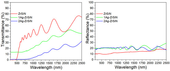 Optical transmittance and reflectance spectra of ZrSiN, 1Ag-ZrSiN, and 2Ag-ZrSiN coatings.