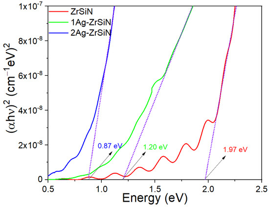 To determine the optical bandgap () of the Ag-ZrSiN coatings, Tauc’s relation was employed [53,54,55,56]: , where hv represents photon energy and α denotes the absorption coefficient. The α values for the coatings deposited were calculated using equation [56]: , where d stands for the thickness of the coating, T represents the transmittance, and R corresponds to the reflectance. Figure 7 illustrates the Tauc’s plot, where extrapolating the linear region (α = 0) provides the value of . The obtained values are 1.97 eV for the ZrSiN coating and 1.20 eV and 0.87 eV for the 1Ag-ZrSiN and 2Ag-ZrSiN coatings, respectively. As can be seen, the optical bandgap decreases with an increase in the Ag content. This decrease could be attributed to the increase in carrier concentration [57], or it may be associated with the size of the silver crystallites, as evidenced by the XRD results.