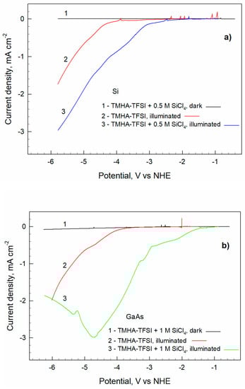 (a) Cathodic polarization curves obtained at the potential sweep rate of 25 mV s−1 for p–Si in the electrolyte TMHA—TFSI + 0.5 M SiCl4 in the dark (1) and under illumination (3). ΔCurve 2 shows the photocurrents for the illuminated electrode in the precursor-free electrolyte. (b) shows the curves analogous to (a) determined for the p–GaAs electrode in the electrolyte with 1.0 M SiCl4.