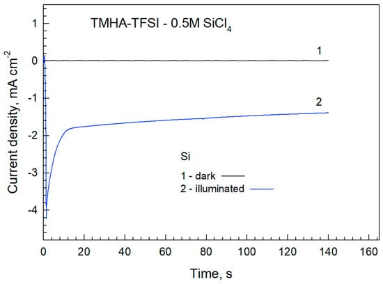 Chronoamperogram obtained for p–Si electrode at ΔE = −4.2 V in TMHA–TFSI + 0.5 M SiCl4 electrolyte in the dark (1) and under illumination (2).