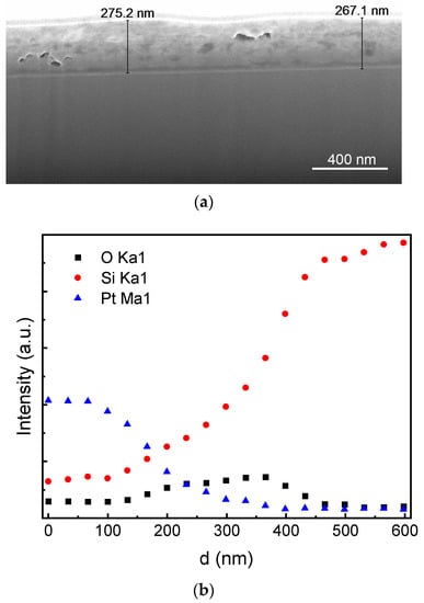 The deposited sample contained some oxygen. Figure 4b identifies the thickness of the oxygen-containing structure. The zone where the content of sputtered Pt drops down signifies the Pt/Si–O interface, and the zone where Si content reaches a limit signifies the thickness of the deposited layer. Note that some surface oxidation under ambient conditions is unavoidable. This is especially relevant in the case of thin layers. It is worth mentioning that the Si oxidation suggests an opportunity for electronic passivation as well as an improvement in antireflection performance due to interfacial light trapping. Porous silica (SiO2) antireflective coatings prepared by the sol–gel process have been proposed. For instance, antireflection coatings based on SiO2 nanocomposites have been reported to exhibit high levels of transparency, resistance to moisture, and antifogging properties [31,32].