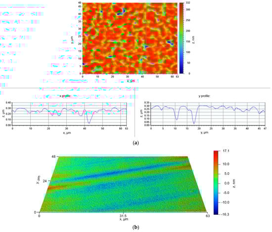 Furthermore, we will focus on the deposition processes at high electrode polarization where electrolyte decomposition is possible (∆E = −5.7 V, Figure 5, Figure 6 and Figure 7). Figure 5 shows the topographical data obtained for the profile of the deposited layer that extends over tens of micrometers. The surface roughness characterized by the top-to-valley distance (z) is mostly less than 100 nm; in some areas, however, the distance can reach z ~300 nm (indicated in blue). The topographical data in Figure 5b demonstrates the surface features of the pristine p–Si substrate on which the layer was deposited. The surface is rather smooth; its roughness is much less than that of the deposited layer. The image identifies the greatest value of z ~37 nm.