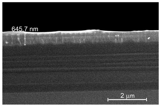 The SEM image in Figure 6 shows the cross-section of the sample; it identifies the thickness of the deposited layer to be ~0.65 μm.