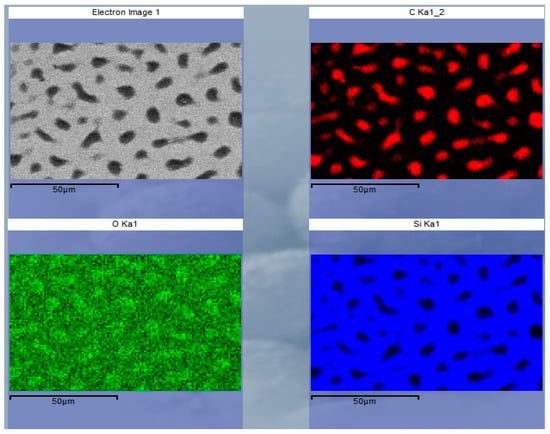 Th elemental composition of the deposited layer has been studied by EDS (Figure 7). A significant amount of carbon (~18 at.%) was co-deposited with silicon. Carbon deposition was also confirmed by XPS. The 1s energy spectrum identified 19.9 at.% of the elemental carbon on the sample surface. A characteristic feature is that carbon is distributed within the silicon in the form of micrometer-sized inclusions (red or dark spots in Figure 7). Note also that GI-XRD did not indicate any crystallinity features of the deposited layer, indicating its amorphous structure (Supplementary Section).