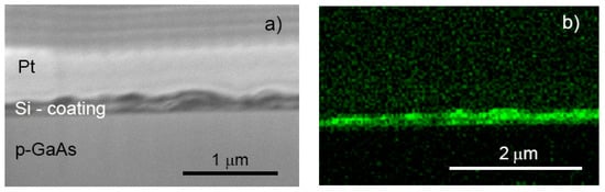 A thin layer (~300 nm) of Si–C structure was deposited photoelectrochemically on the GaAs substrate as well (Figure 8). GI-XRD did not indicate any crystallinity features of the layer.