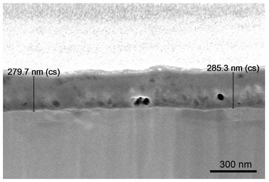 Figure 4 demonstrates the principal opportunity for PEC deposition of Si coating on a p–Si substrate. The deposition has been performed in a potentiodynamic mode at a scan rate of 10 mV s−1, covering a wide potential region from the open circuit potential (Eocp) to the polarization ∆E = −5.0 V, where electrolyte decomposition is possible (Figure 2a). SEM-EDS identified the deposition of a silicon-containing layer, which was about 270 nm thick (Figure 4). The Si deposition began when the equilibrium potential E0Si4+/Si was exceeded, and the process continued to rise with the negative potential shift. In the far polarization region, simultaneous decomposition of the electrolyte was possible; however, no carbon was detected in the deposit by the XPS (no C 1s peak). Carbon deposition under potentiostatic conditions will be discussed later.