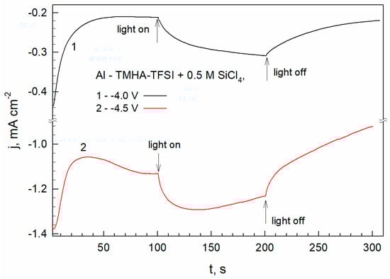 Photocurrents measured under potentiostatic polarization (∆E = −3.7 V and −4.3 V) in the dark and when illumination was switched on and off. The measurement has been performed using AA 2024 substrate in the electrolyte composed of TMHA, TFSA and 0.5 M SiCl4.