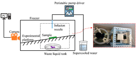 The water droplets hit the sample at a certain speed, and the indicator was the freezing time of the droplets, t. The experimental setup consisted of four parts: a refrigeration unit, an infusion unit, a homemade 30° tilting stand, and a computer, as shown in Figure 3. The substrate temperature was −25~−5 °C. The distance between the infusion nozzle, the sample was controlled to be 10 cm, and the speed was constant, 10~15 drops per minute. The camera recorded the freezing process of the droplets and the freezing time of the droplets.