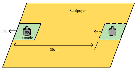 A 600-mesh sandpaper sheet was fixed on the ground as the wear surface, and a 100 g weight was placed above the sample as the wear load. A thin wire was connected to the sample at one end and a linear reciprocating motor at the other end. The motor was set to run at a speed of 2 cm/s. The sample was pulled slowly with a thin wire at a uniform speed and with a force parallel to the direction of the sandpaper, so that the sample and the weight moved together. One wear event was counted from one end of the sandpaper to the other end (20 cm). After 50, 100, 150, 200, and 250 times of wear, the macroscopic shape of the sample was observed, and the contact and rolling angles were measured (see Figure 4).