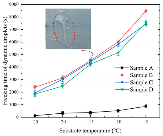 The formulations of samples A, B, C, and D preparation formulations in the figure were shown in Table 1. The complete freezing times of droplets on the surfaces of samples A, B, C, and D were 4.3 s, 16.8 s, 14.1 s, and 8.2 s at −25 °C (see Figure 8). As the temperature increased, the complete freezing times of droplets all increased accordingly, and the increased times of samples B, C, and D were larger than the freezing time of sample A. At −5 °C, the complete freezing times of samples A, B, C, and D were 10.5 s, 837 s, 756 s, and 737 s.